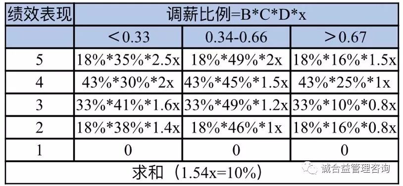 如果全年调薪的空间为10%,则我们可以计算每一个x的代表的调薪比例,从而确定不同薪酬水平、不同绩效等级的员工应该调整多少薪酬。