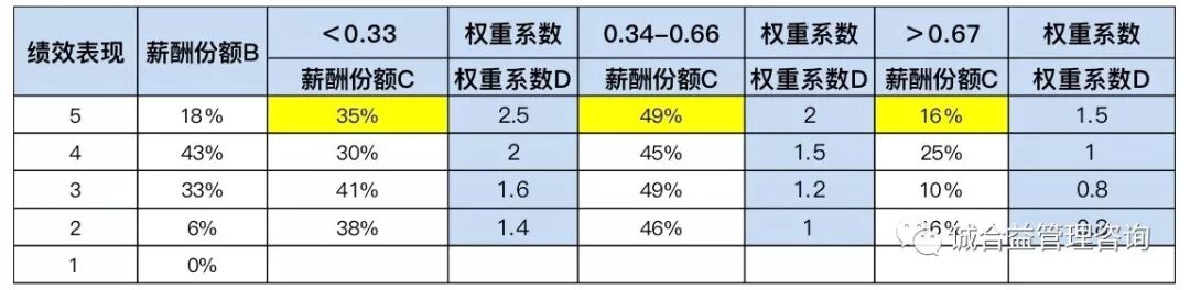 纵向来看,是员工的绩效等级,“薪酬份额”是指处在该绩效等级的员工总薪酬占比。以第一行为例,18%指绩效等级为5级的员工,其薪酬总额占全员的18%;35%指绩效等级为5级的员工中,CR值在下1/3段的员工,其薪酬总额占5级员工总额的35%;2.5则是绩效等级为5级,CR值在下段员工的权重系数,以此类推。其中权重系数设置的基本原则是,绩效等级越高,权重越高;CR段位越高,权重越低。