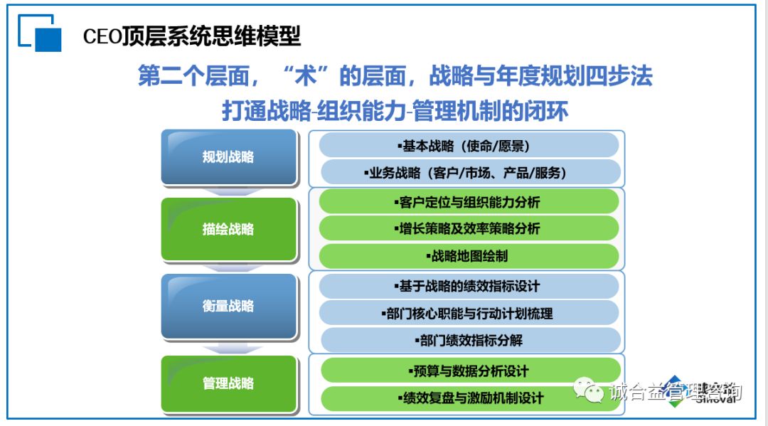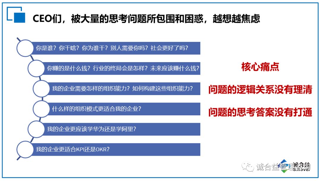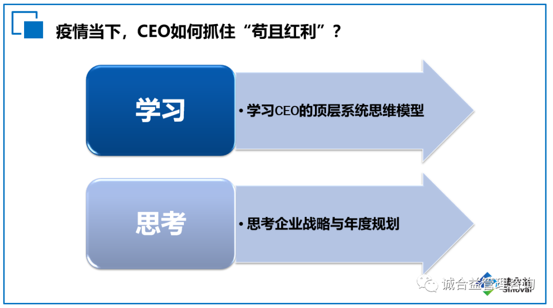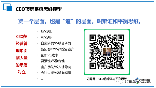 过年期间,我又认真地听了一遍罗振宇的2020年跨年演讲《时间的朋友》,我对其中一个名词记忆犹新也特别认同,叫“苟且红利”。 大家都理解什么叫红利,虽然我们这两年都在担心中国各种宏观环境,但事实上从社会经济发展的大环境来看,中国依然有着非常多的红利和机会。那什么叫苟且红利呢?简单点说就是,对于一个企业来讲,你只要比同行业同规模企业多努力一点,多一点效率、多一点创新、多一点客户导向,你就能比别的企业更快更好地发展;而对于个体来说,你只要比你的同事朋友多努力一点,多一点学习、多一点思考、多一点付出,你就能比别人有更好的职业发展。 我自己也是一家咨询公司的CEO,面临春节期间的疫情,一开始每天也是身处对疫情爆发的恐慌和对企业生存发展的焦虑中,但很快我想到了“苟且红利”,所以从大年初六开始,逐步调整进入闭关学习和反思的状态,也通过各种方式让团队小伙伴们静下心来实现在家办公、学习和交流,这期间内部似乎有了比平时更多的互动沟通、部分人员的效率产出也更加直观可见。 那大家想想,当下的疫情给我们带来什么样的机遇或者红利呢?我觉得就是难得的、大把的自由掌控时间,如何用好这些时间将成为企业和企业、个人和个人之间的分水岭,所以送给大家一句话:切勿让自己的苟且成为他人红利。这也是我跟自己的团队在第一次线上会议中讲的。 那大家想想,当下的疫情给我们带来什么样的机遇或者红利呢?我觉得就是难得的、大把的自由掌控时间,如何用好这些时间将成为企业和企业、个人和个人之间的分水岭,所以送给大家一句话:切勿让自己的苟且成为他人红利。这也是我跟自己的团队在第一次线上会议中讲的。 那作为企业CEO,如何让这段时间价值最大化呢?我认为就是两个在普通不过的词了:学习和思考,学习CEO的顶层系统思维模型、思考企业战略与年度规划。 为什么叫顶层系统思维模型呢?这几年,各种线上线下的培训课程好像给我们CEO抛出了太多需要思考的问题,比如: 你是谁?你干啥?你为谁干?别人需要你吗?社会更好了吗? 你赚的是什么钱?行业的终局会是怎样?未来应该赚什么钱? 你的企业需要怎样的组织能力?如何构建这些组织能力? 我认为这些都是非常好的问题,我自己在做企业过程中,也会受这些问题的启发,但同样,对于这些问题的思考又好像让我们越想越焦虑。 其实,焦虑的关键不在于这些问题本身,而在于对这些问题的逻辑关系没有理清,对这些问题的思考答案没有打通,就像中医里面说的“不通则痛”。 我在企业咨询辅导过程中给遇到过很多的CEO,我自己的总结是:CEO要学习和掌握的顶层思维模型包括有两个层面: 第一个层面,也是“道”的层面,叫辩证和平衡思维。 所谓的“辩证与平衡”,就是将看似矛盾对立的目标在思维中融合且统一共存,同时在行动中做好平衡和兼顾。 我们伟大的革命领袖毛主席就是非常厉害的辩证与平衡思维的典范,他在《论持久战》中给革命者们提出了抗战既不会速胜也不会速败的平衡选项。再比如伟大的企业领袖任正非所提倡的灰度管理,也体现出管理从来就不是非黑即白的简单对立。 而我们现在面临的疫情危机道理也是如此,危中有机、转危为机,这都需要辩证与平衡:既要客观接纳眼前遇到的困境,也要从另一个角度或更长远的视角思考困境中存在的机会并采取行动。过去优秀的企业其实都是这么干的,最类同的案例就是2003年SARS疫情期间,阿里巴巴孕育了淘宝、京东开启了线上电商、海底捞开启了上门服务、来伊份大举收购门店和扩张等。 作为CEO,在企业经营管理中会遇到非常多矛盾对立的事,我们再举个例子。比如效率和创新,大部分人的理解是追求效率就是要流程化、标准化、信息化,这和创新好像是矛盾对立的,但优秀的CEO是将效率和创新融合的,高效率是创新的基础,因为这样可以有更多的资源精力投入到创新中,而创新又是推动组织效率上一个新台阶的第二曲线,而且创新本身也需要流程机制来保证高效的结果产出,而不是漫无目的地试错。 所以,破解矛盾困境的关键就在于CEO及高管们能不能拥有辩证与平衡的思维方式。 我之前一直想开个公众号写些管理的文章,因为在咨询过程中接触很多企业CEO及高层管理者,有些感悟和想法。但一直没想到好的切入点,直到这次疫情危机,我才正式确定并推出我的个人公众号:“CEO的辩证与平衡思维”,希望能针对CEO在经营管理中面对的各种矛盾对立的目标如何融合和平衡做些探讨,当然现在才刚发了第一篇文章,感兴趣的朋友欢迎关注。 CEO的顶层思维模型的第二个层面,也可以说是“术”的层面,是战略与年度规划的思维模型与工具方法。 这个对于CEO的思维模型来说是术的层面,但对公司来说其实是道的层面。在家封闭的这段时间里,我和所有小伙伴一起借助系统的思维模型和工具方法对诚合益的未来发展及2020年规划做了深入的思考、研讨和碰撞,经过这样充分的碰撞和思考,让我们的内心更加安定和笃定,对于企业渡过难关和更好地发展更有信心。