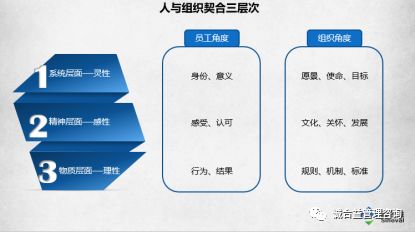 第二层是精神层面,核心关注员工的社交、尊重需要,让员工不仅获得金钱的满足,更能在情感上获得关注、获取荣誉认可度、身份认可度。因此,组织需要从关怀员工的角度考虑内部文化氛围的构建,员工能力的发展等。这个层面强调感性、感受,更多针对人的身份认可来构建方法,营造人心。