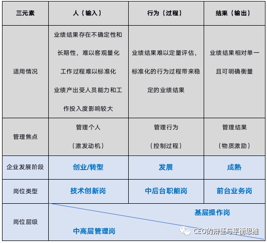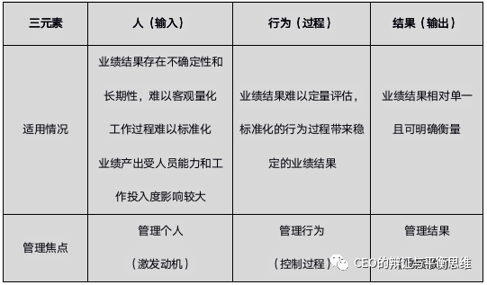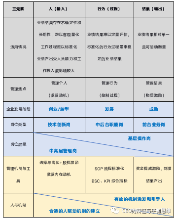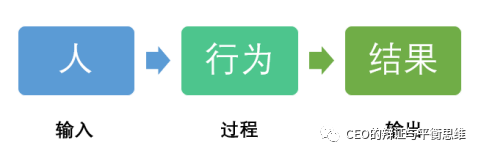 其次,要澄清一个虽然简单易懂但很多CEO可能没想清楚的思考逻辑,企业想要的是有效的结果产出,而结果产出是受员工过程行为所影响,员工过程行为又是人所产生的,也就是人是输入、行为是过程、结果是输出。我们暂且把这三个点成为管理三元素。
